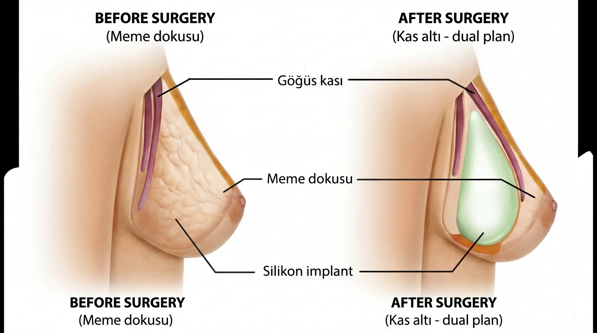 Kesi Yerleri: İzlerin gizlenmesi için genellikle meme altı kıvrımı (inframammary) tercih edilir. Bu bölge, izin sütyen veya bikini hattında kalarak görünmez hale geldiği en ideal noktadır.