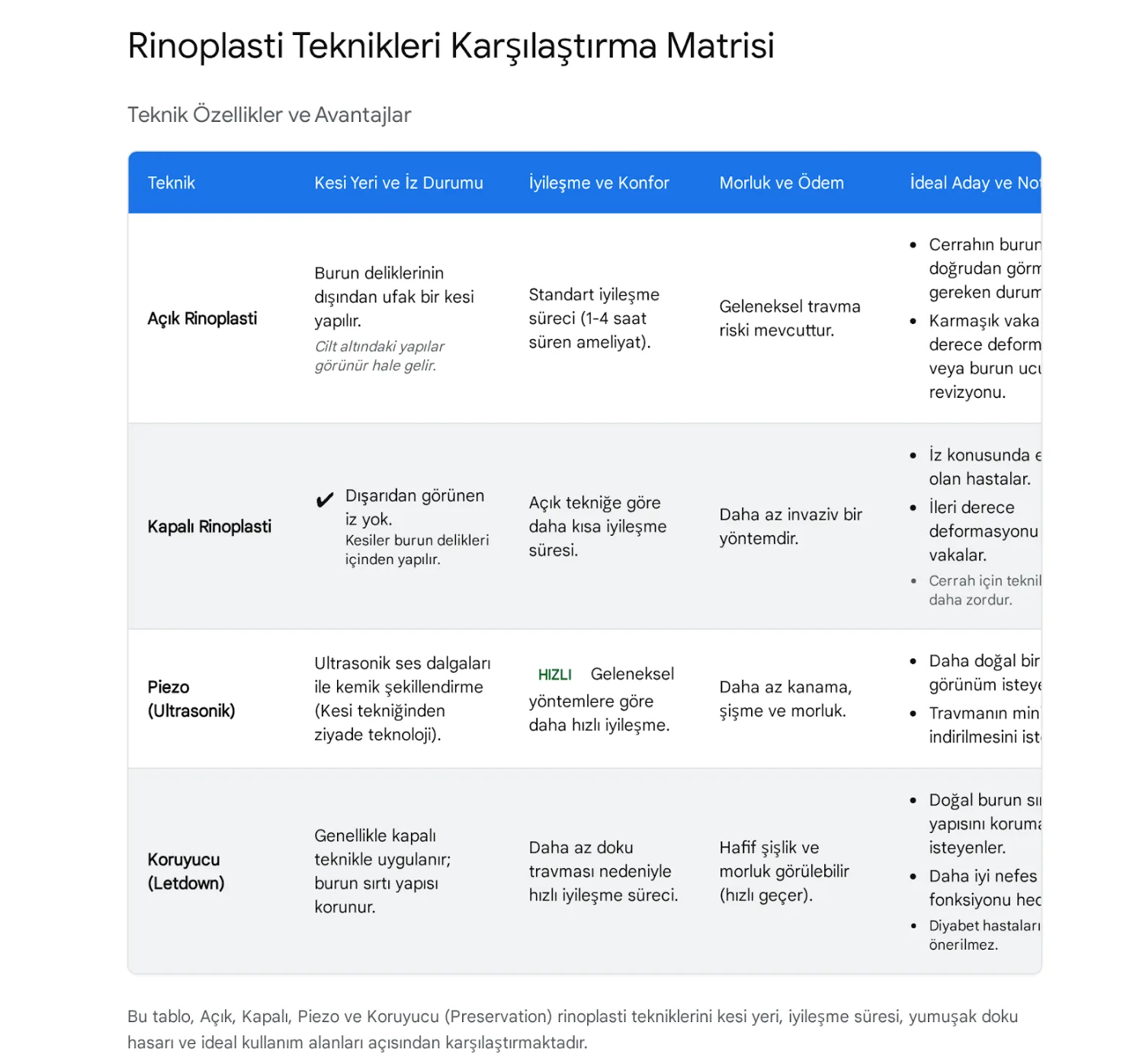 Piezo (Ultrasonik) Rinoplasti: Kemiklerin çekiç ve keski yerine ultrasonik ses dalgaları ile kesilmesidir. Yumuşak dokulara, damarlara ve sinirlere zarar vermediği için ameliyat sonrası morluk ve şişlik minimum düzeyde olur. Kemik iyileşmesi daha hızlı ve kontrollüdür.