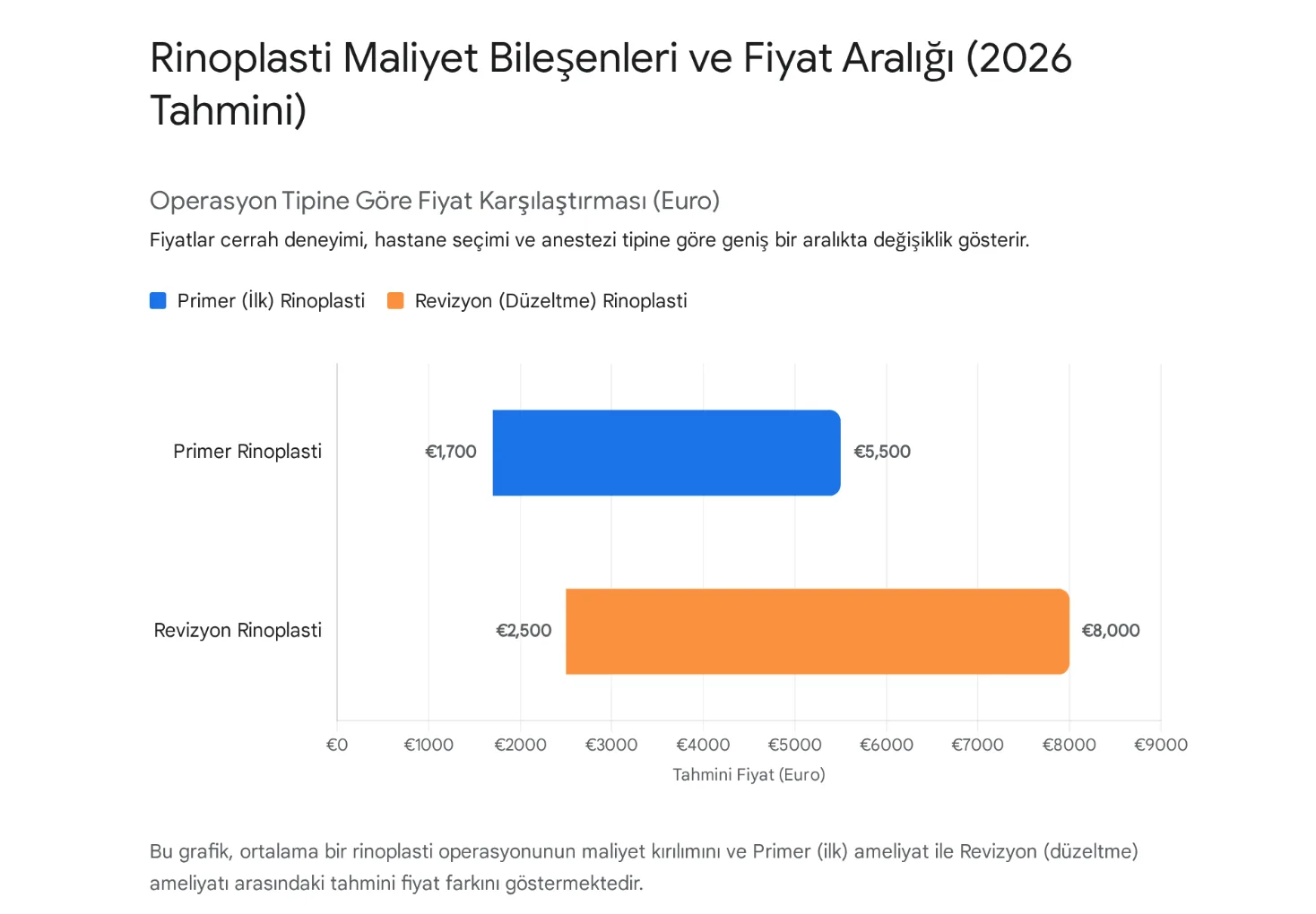 Primer (İlk) Rinoplasti: Ortalama olarak 50.000 TL - 250.000 TL (yaklaşık €1.700 - €5.500) aralığında değişmektedir.